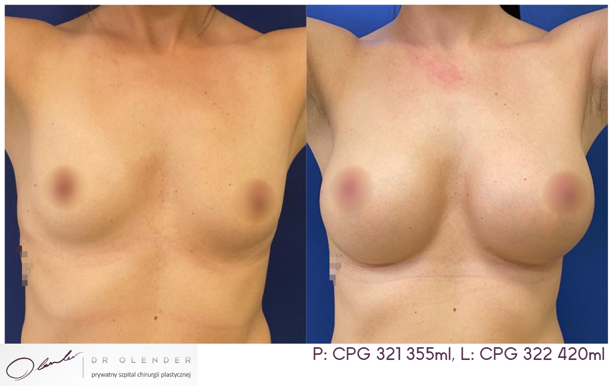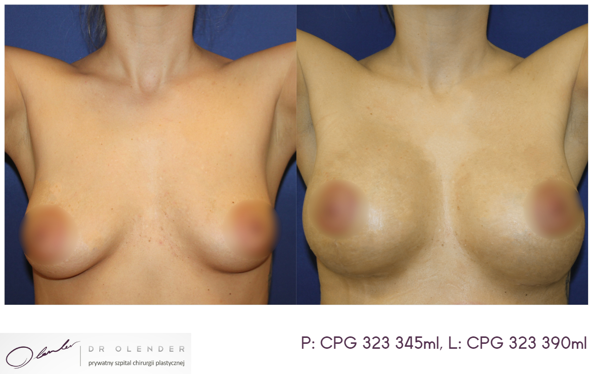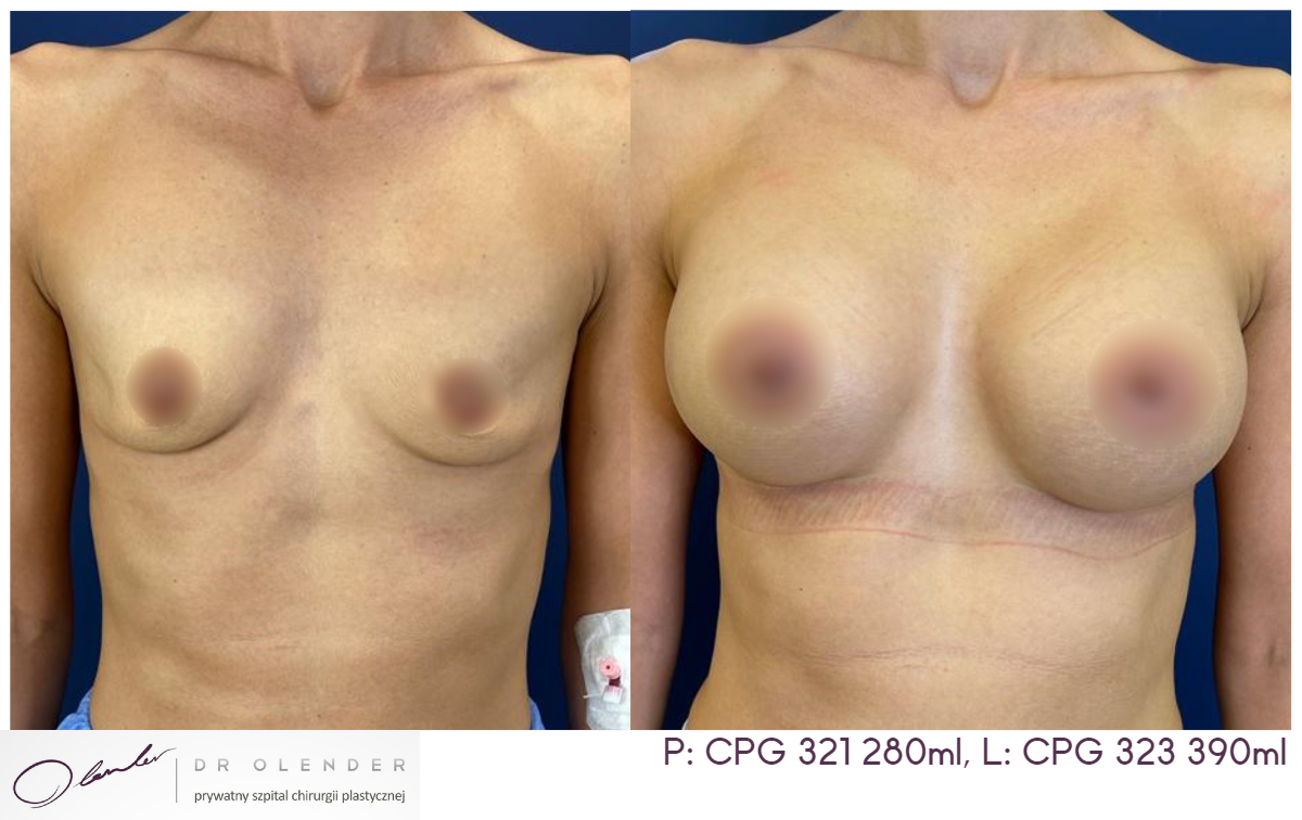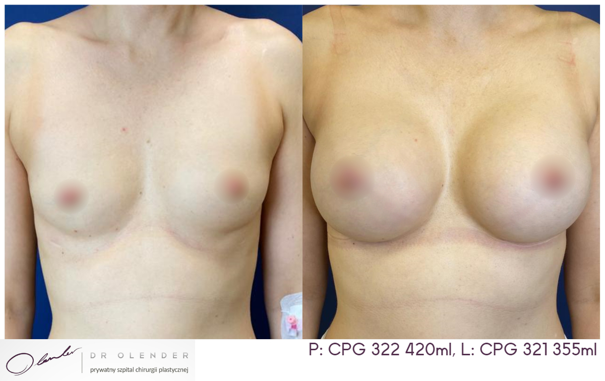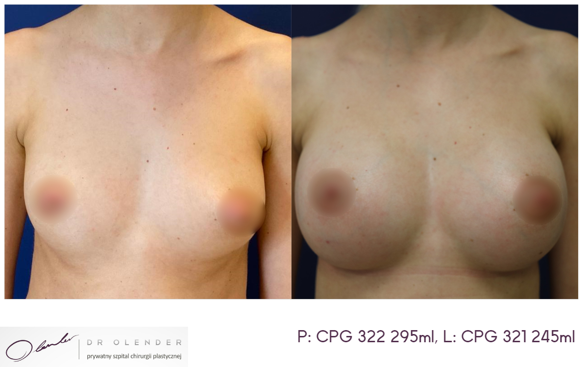 Pacjentka przyjeżdża do Kliniki na czczo. Personel Kliniki wyposaża pacjentkę w jednorazowe ubranie, w które należy się przebrać po wcześniejszej kąpieli. Następnie Pacjentka wjeżdża na sale przedoperacyjną, na której chirurg upewnia się czy rodzaj, rozmiar i kształt implantów dobranych w czasie konsultacji jest odpowiedni. Operacja poprzedzona jest konsultacja lekarską, podczas której wykonywane są dokładne pomiary klatki piersiowej. W Klinice Chirurgii Plastycznej Dr Olender pracujemy na implantach najlepszych światowych producentów, które są bardzo dobrze przebadane, gwarantując nie tylko wspaniały efekt estetyczny, ale przede wszystkim najwyższe standardy bezpieczeństwa [2,3]. Pacjentka przez cały czas trwania operacji jest pod opieką całego zespołu operacyjnego, w tym lekarza anestezjologa, który czuwa nad prawidłowym przebiegiem znieczulenia ogólnego. Zabieg trwa przeciętnie około 2 godziny. W czasie jej trwania chirurg plastyk preparuje loże dla implantów. W naszej klinice standardem jest metoda dual-plane z dostępu w fałdzie podpiesiowym. Oznacza to, że chirurg wykonuje nacięcie długości 4-5cm pod piersią, a implant docelowo znajdzie się częściowo pod mięśniem piersiowym większym i częściowo pod tkanką gruczołową. Jest to metoda niezwykle dobrze przebadana, dająca bardzo dobre efekty kosmetyczne z jednoczesnym bardzo niskim odsetkiem powikłań (np. przykurcz torebki włóknistej, przebijanie implantu przez skórę etc.). Zwieńczeniem operacji jest założenie drenów (przewodów które chronią przed gromadzeniem się krwi wokół implantów, a także estetyczne zszycie rany i wykonanie opatrunku.