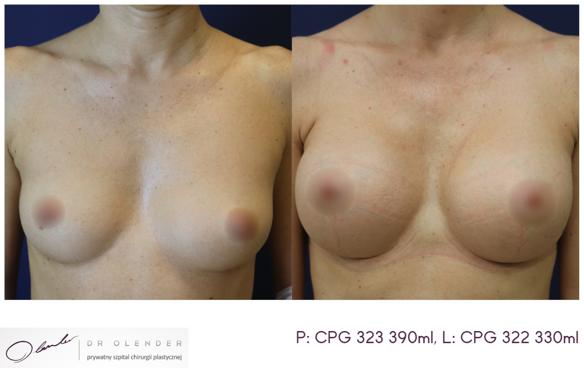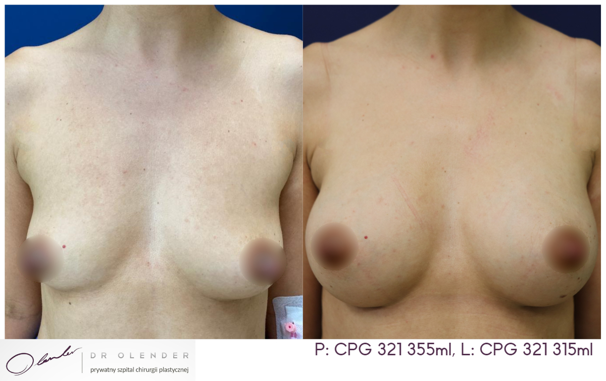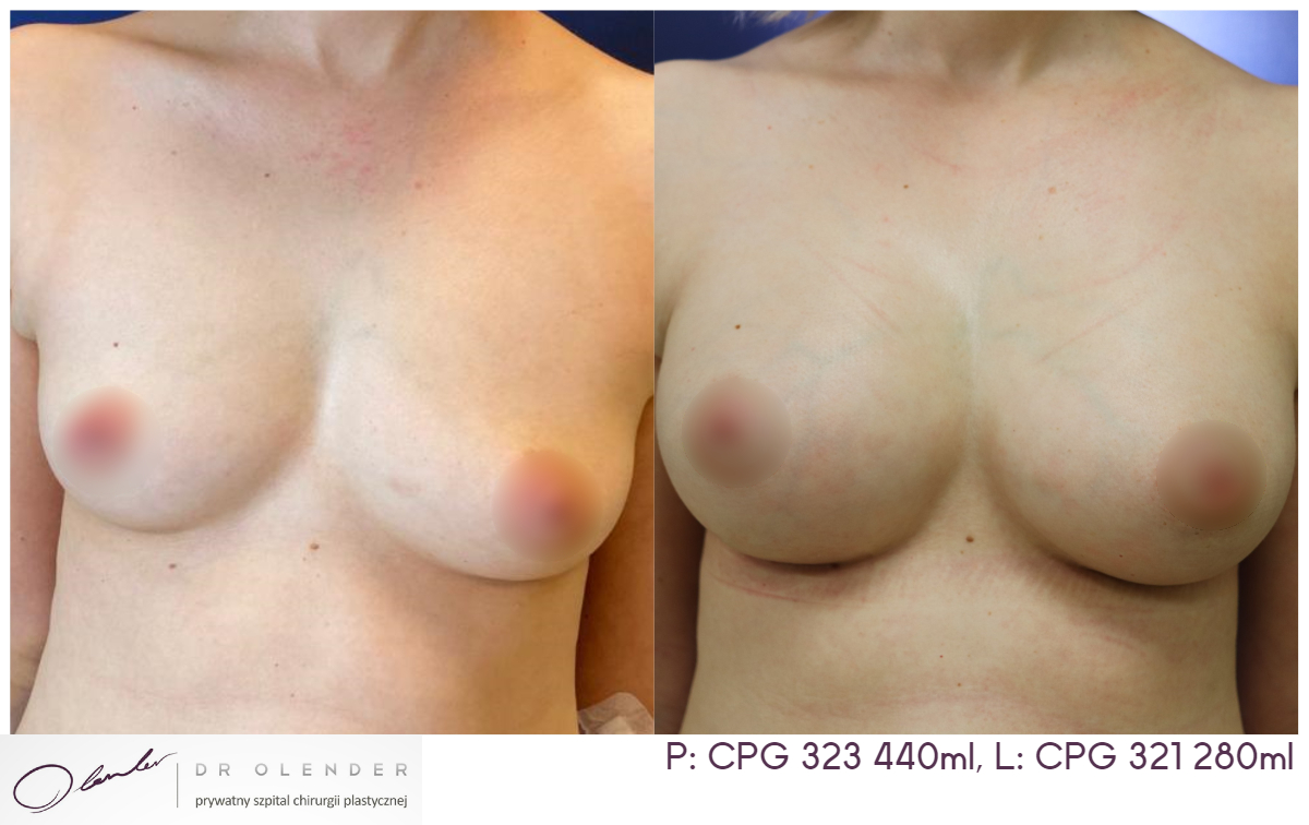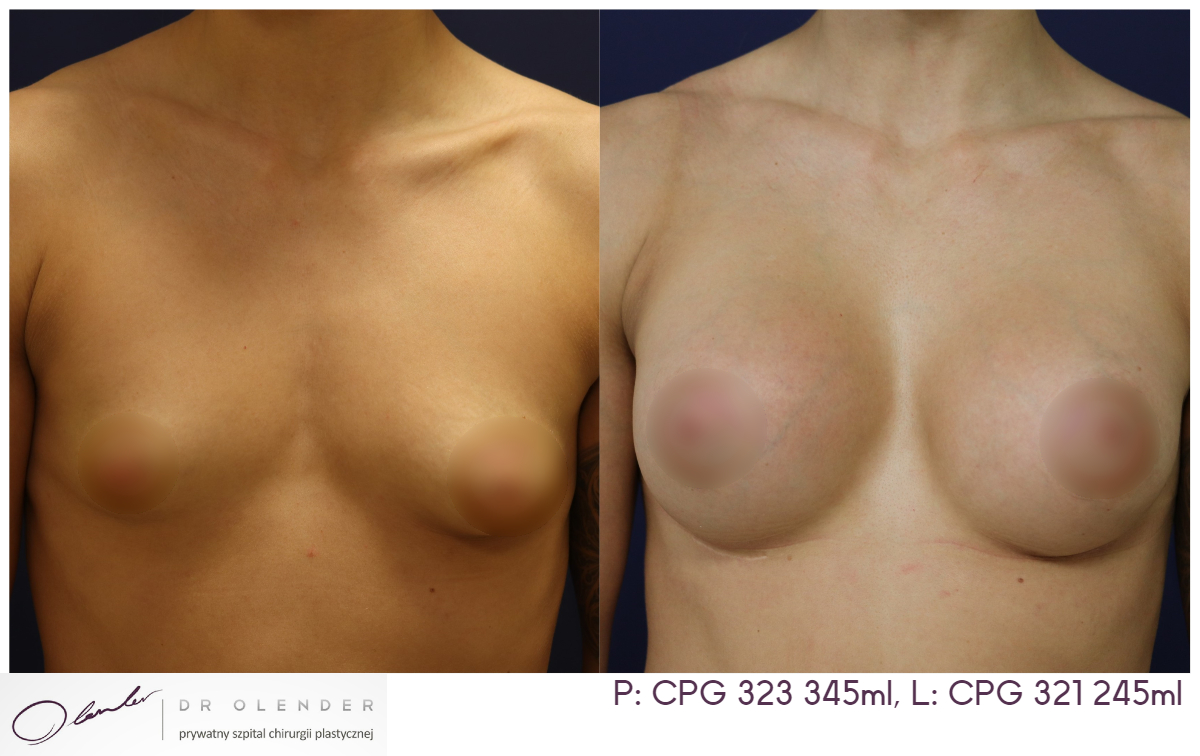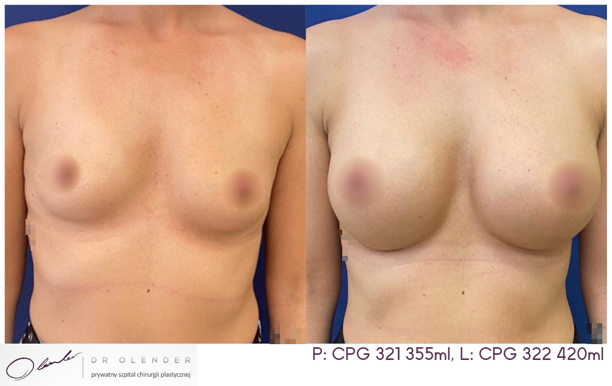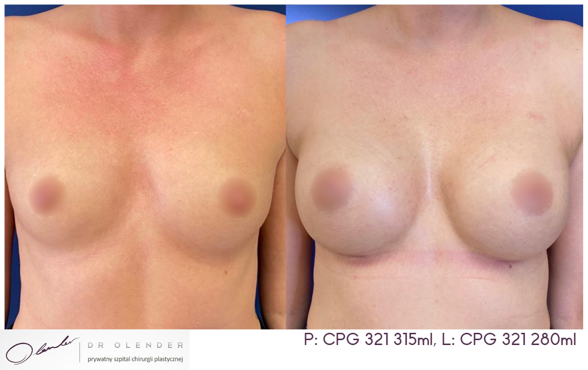 Pacjentka przyjeżdża do Kliniki na czczo. Personel Kliniki wyposaża pacjentkę w jednorazowe ubranie, w które należy się przebrać po wcześniejszej kąpieli. Następnie Pacjentka wjeżdża na sale przedoperacyjną, na której chirurg upewnia się czy rodzaj, rozmiar i kształt implantów dobranych w czasie konsultacji jest odpowiedni. Operacja poprzedzona jest konsultacja lekarską, podczas której wykonywane są dokładne pomiary klatki piersiowej. W Klinice Chirurgii Plastycznej Dr Olender pracujemy na implantach najlepszych światowych producentów, które są bardzo dobrze przebadane, gwarantując nie tylko wspaniały efekt estetyczny, ale przede wszystkim najwyższe standardy bezpieczeństwa [2,3]. Pacjentka przez cały czas trwania operacji jest pod opieką całego zespołu operacyjnego, w tym lekarza anestezjologa, który czuwa nad prawidłowym przebiegiem znieczulenia ogólnego. Zabieg trwa przeciętnie około 2 godziny. W czasie jej trwania chirurg plastyk preparuje loże dla implantów. W naszej klinice standardem jest metoda dual-plane z dostępu w fałdzie podpiesiowym. Oznacza to, że chirurg wykonuje nacięcie długości 4-5cm pod piersią, a implant docelowo znajdzie się częściowo pod mięśniem piersiowym większym i częściowo pod tkanką gruczołową. Jest to metoda niezwykle dobrze przebadana, dająca bardzo dobre efekty kosmetyczne z jednoczesnym bardzo niskim odsetkiem powikłań (np. przykurcz torebki włóknistej, przebijanie implantu przez skórę etc.). Zwieńczeniem operacji jest założenie drenów (przewodów które chronią przed gromadzeniem się krwi wokół implantów, a także estetyczne zszycie rany i wykonanie opatrunku.